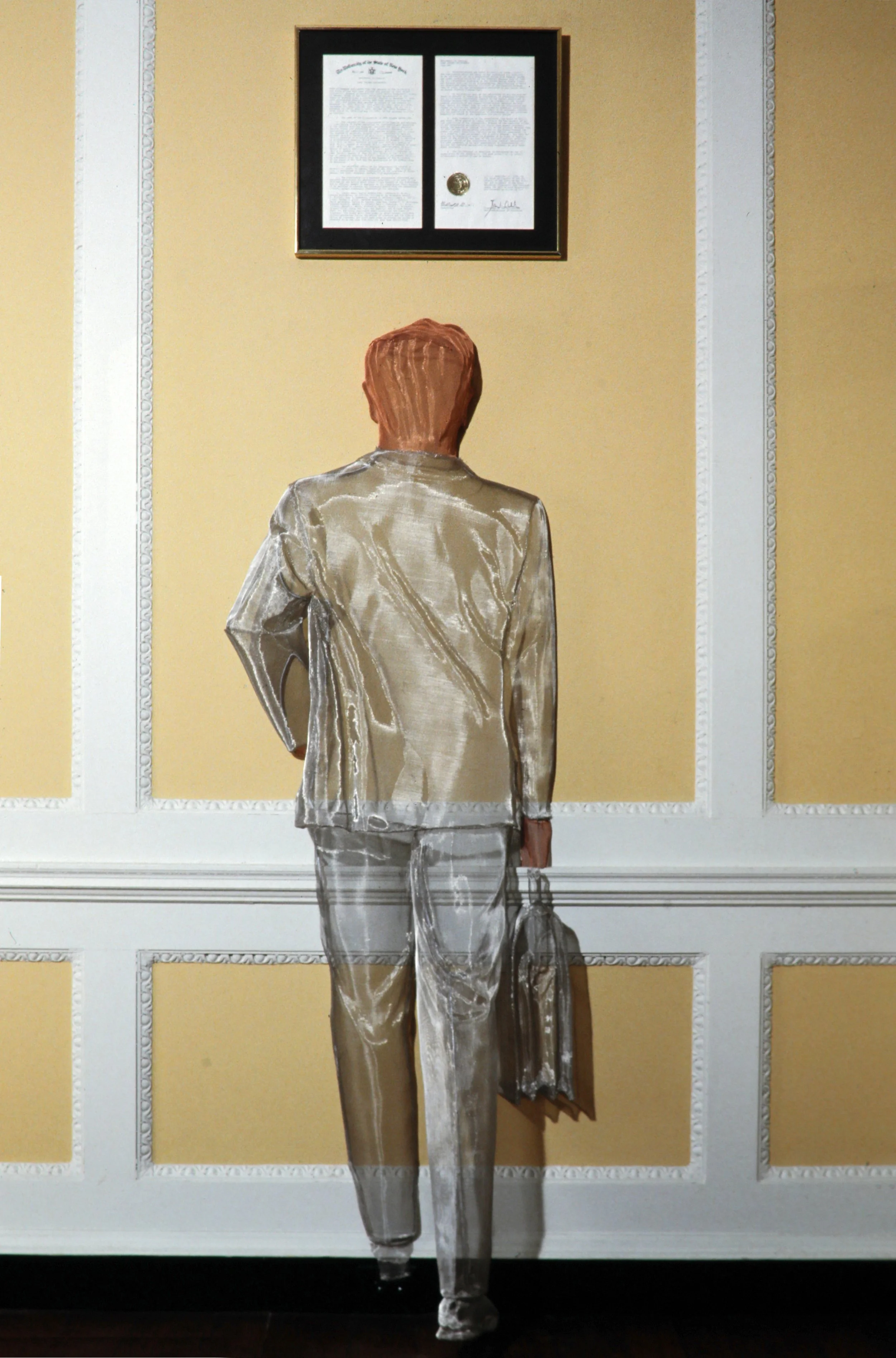 Businessmen, In the President's Boardroom, C W Post, Long Island University, 1987, stainless steel & bronze wire mesh, steel, 76"x29"x12"