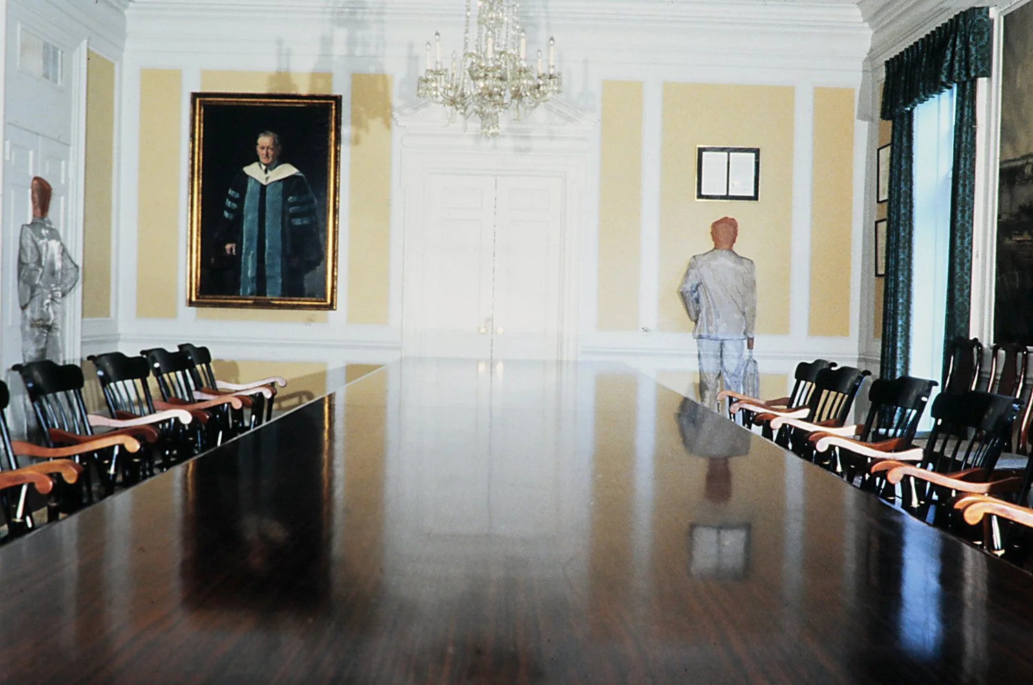 Businessmen, In the President's Boardroom, C W Post, Long Island University, 1987, stainless steel & bronze wire mesh, steel,variable dimensions