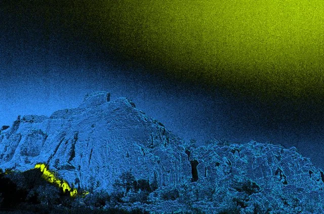 Polarized landscape #3, Collaboration with Matthew H. Smith, PhD Physics, 2002 The image was created from several digital images that were captured with polarizers. The images were then subject to mathematical post-analysis and synthesis. Some species, such as bees, use this polarized pattern as a navigational aid. The state of polarization is represented as color, revealing the striking pattern present in a clear blue sky.